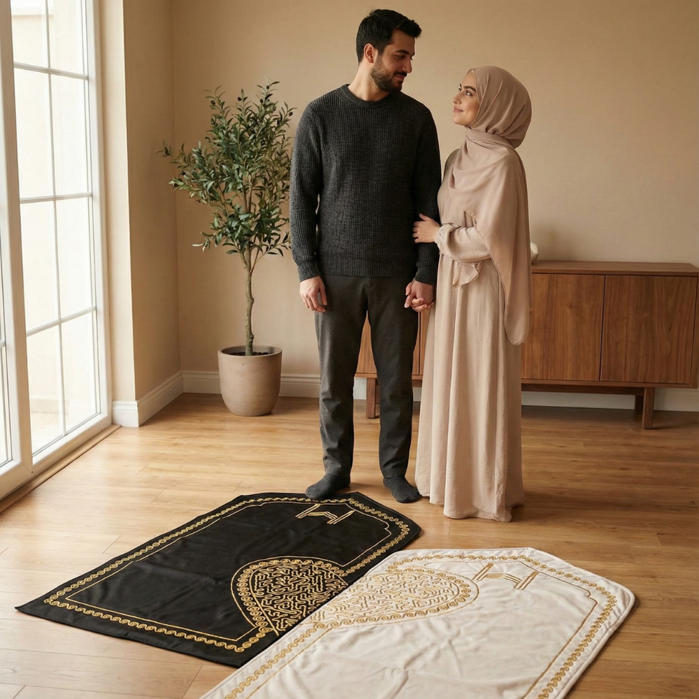 Evet. Erkek önde, kadın geride konumlanacak şekilde tasarlanmıştır. Kalp formu yalnızca yan yana serildiğinde görünür; ibadet düzenini bozmaz.